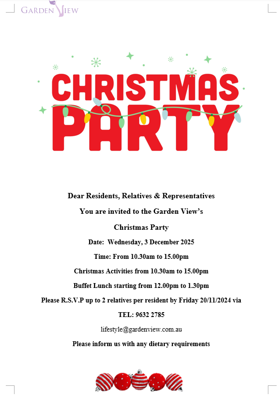 Dear Residents, Relatives & Representatives, You are invited to the Garden View’s Christmas Party. Date: Wednesday, 3 December 2025 Time: From 10.30am to 3.00pm Christmas Activities from 10.30am to 3.00pm Buffet Lunch starting from 12.00pm to 1.30pm Please R.S.V.P up to 2 relatives per resident by Friday 20/11/2024 via TEL: 9632 2785 Email: lifestyle@gardenview.com.au Please...
