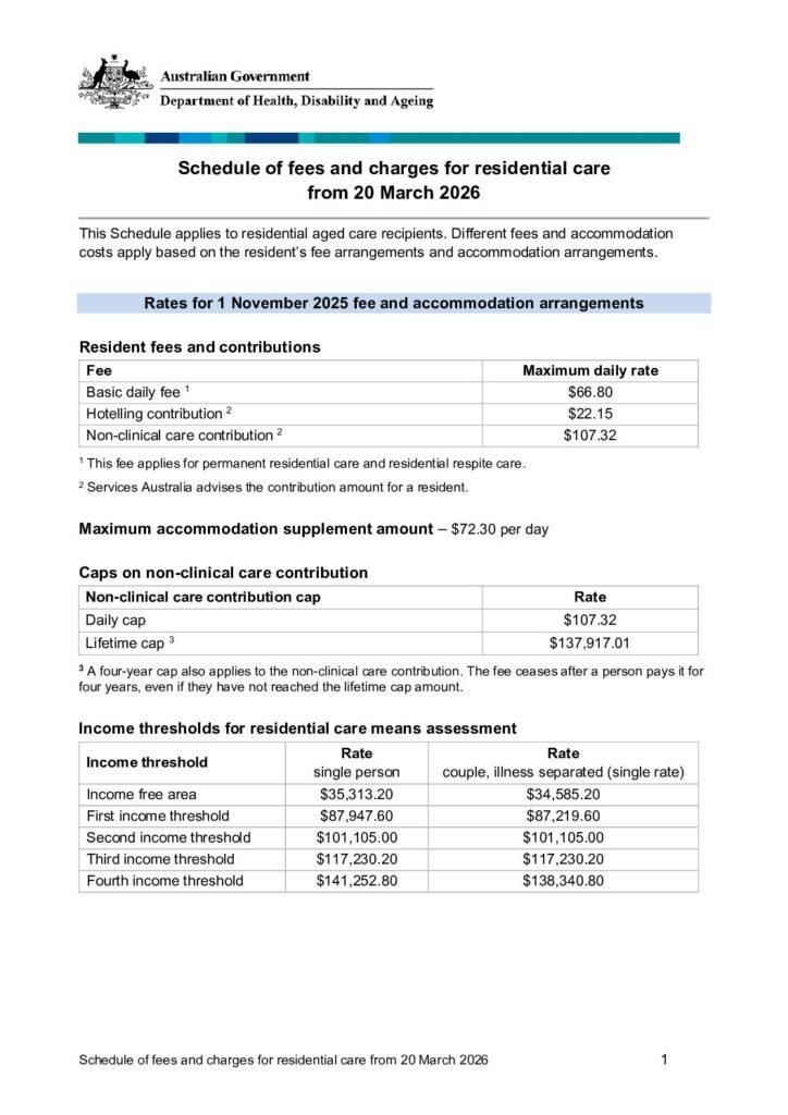 Schedule of fees and charges for residential care from 20 March 2026