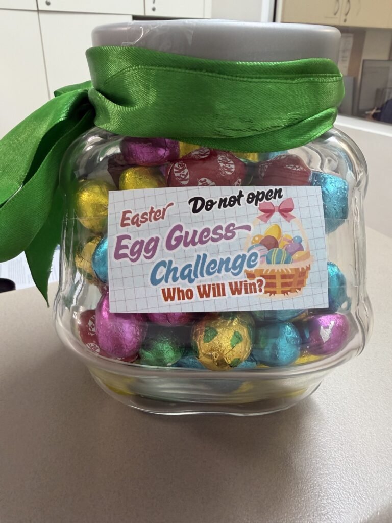 To add some seasonal fun, we are excited to introduce our Easter Chocolate Jar Guessing Competition at reception. Everyone is welcome to participate by guessing how many chocolate eggs are in the jar. The winner will be announced on 07/04/2026, so be sure to join in for a bit of fun and a chance to win!