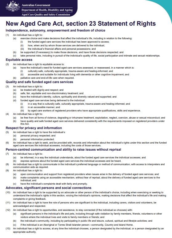 From 1 November 2025, the new Statement of Rights poster will be displayed on our notice board, ensuring everyone is aware of the standards and rights that guide quality aged care.