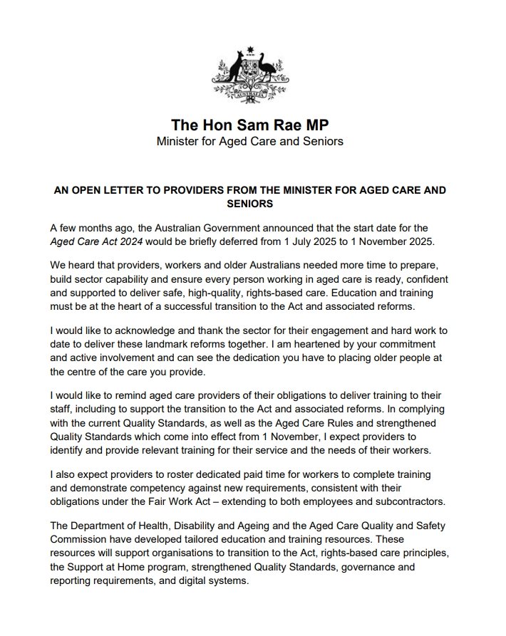 On a broader scale, the Minister for Aged Care and Seniors has released an open letter regarding the new Aged Care Act, now deferred to commence on 1 November 2025. This extension allows providers additional time to prepare, train staff, and update systems in line with the new requirements around governance, reporting, digital systems, and the Support at Home program. The Department of Health, Disability and Ageing has also developed training resources, which we will be incorporating into our staff development plans.