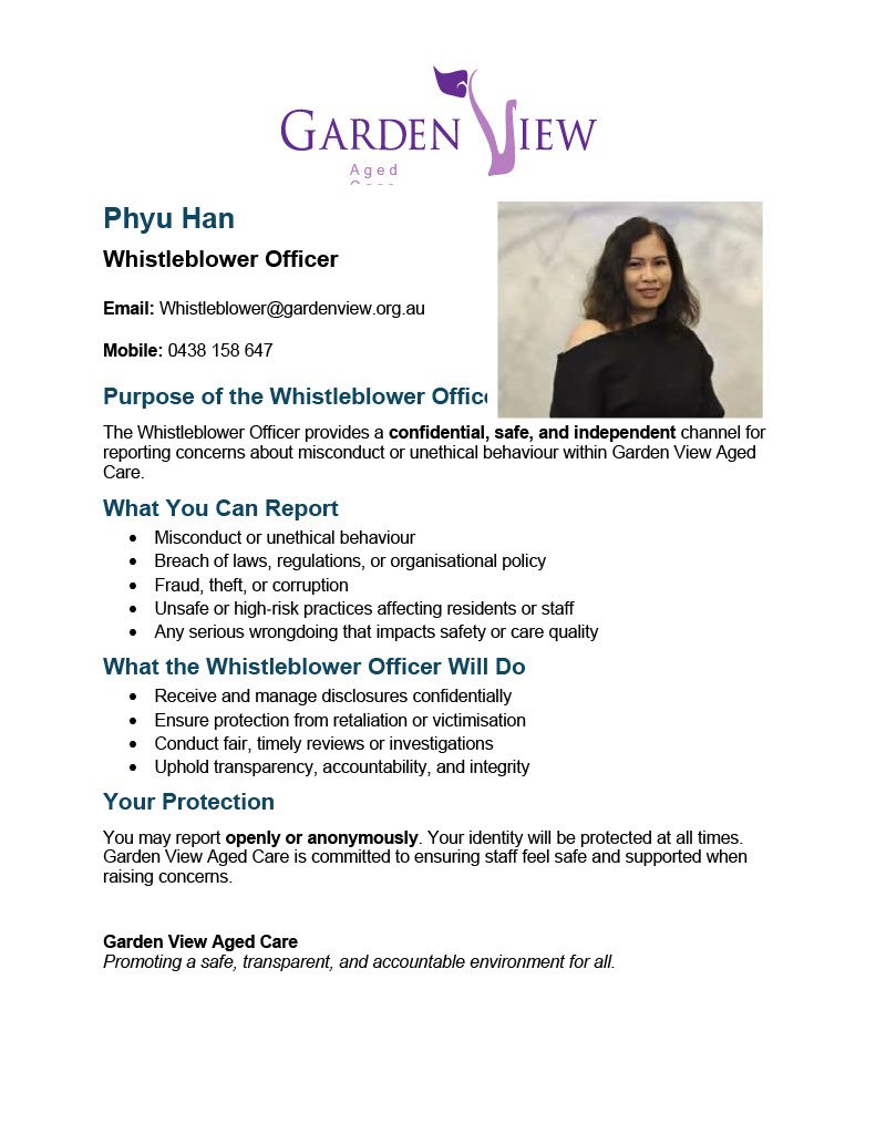 • Garden View provide protections for whistleblowers to allow reporting without fear of reprisal Whistleblower@gardenview.org.au