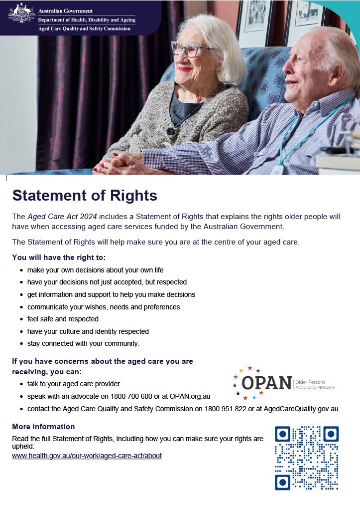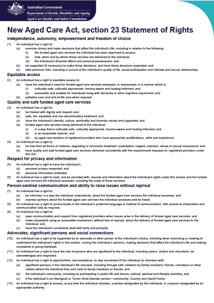 The new Aged Care Act includes a Statement of Rights, outlining the rights that older people have when accessing aged care services. The rights help to ensure that older people and their needs are at the centre of the new aged care system.